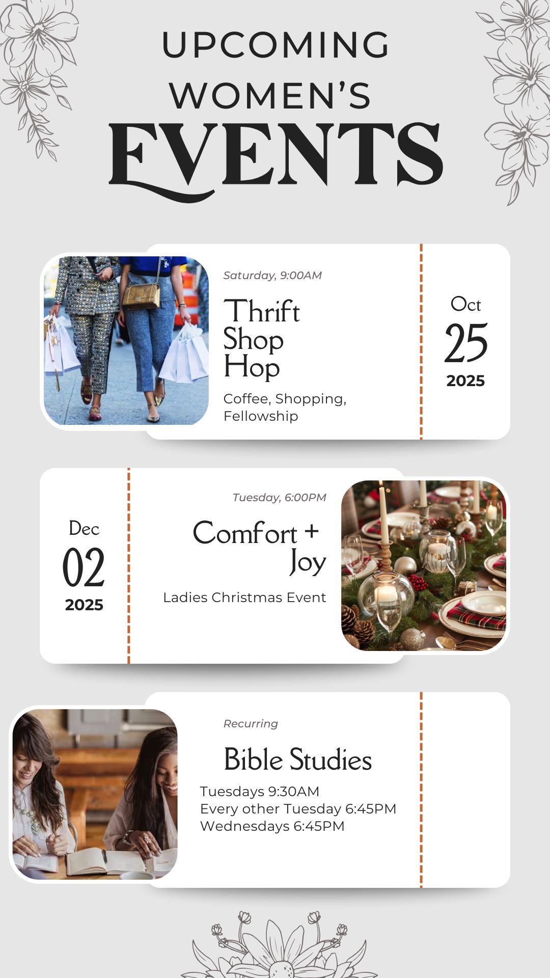 Our Ladies’ Ministry exists to promote a growing relationship with Jesus Christ for women, build fellowship & encourage one another, and provide opportunities for service and ministry.